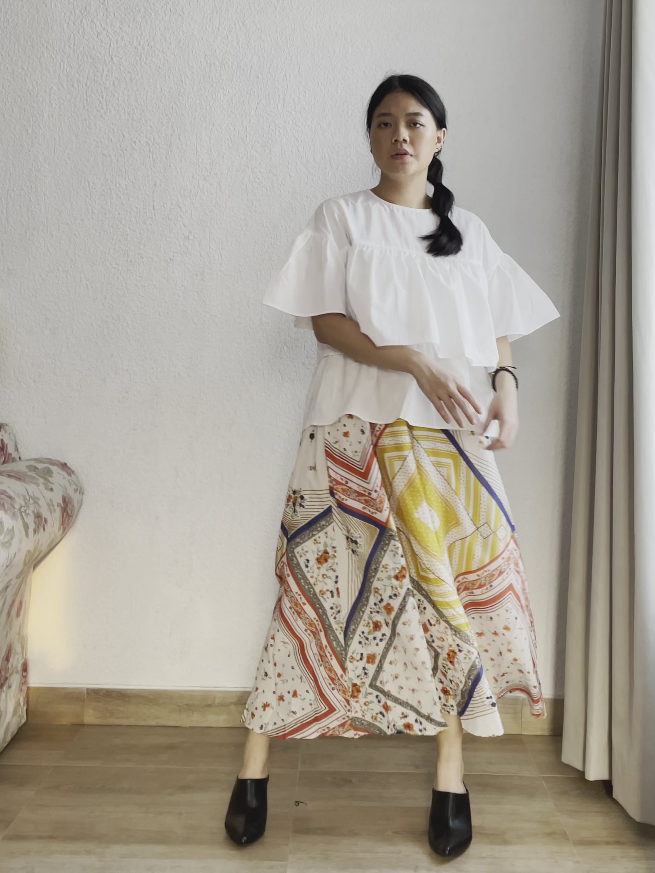 Atasan wanita lengan pendek dengan aksen ruffle pada bagian atas dan bawah, terdapat 1 kancing pada bagian belakang. Bisa dikenakan untuk acara formal maupun non formal, padukan dengan celana jeans untuk tampilan kasual atau rok untuk tampilan yang lebih feminin.