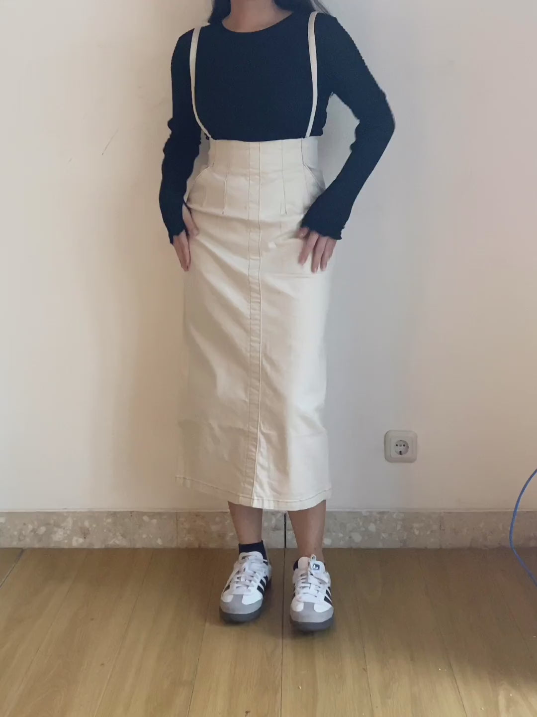 Rok ini bisa dikenakan dengan 2 cara bisa dikenakan bersamaan dengan tali pada bagian bahu atau bisa juga dikenakan sebagai rok nya saja tanpa tali. Terdapat saku pada bagian samping serta zipper pada bagian belakang. Terdapat aksen slit pada bagian belakang memberikan kesan feminin.