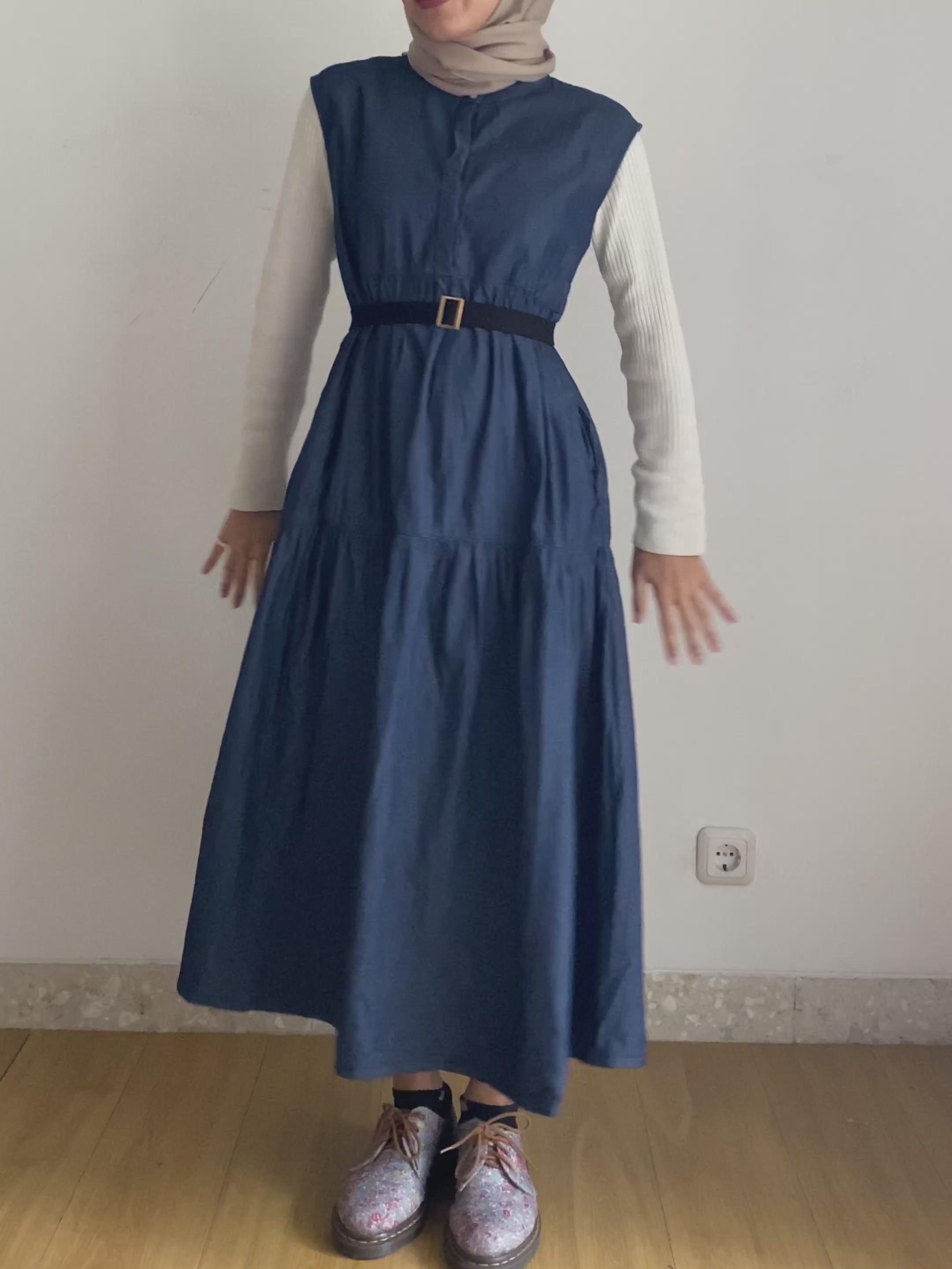 Dress wanita denim tanpa lengan ini di desain dengan aksen ruffle tingkatan yang memberikan kesan unik dan cantik, terdapat kancing pada bagian dada serta saku pada bagian samping.