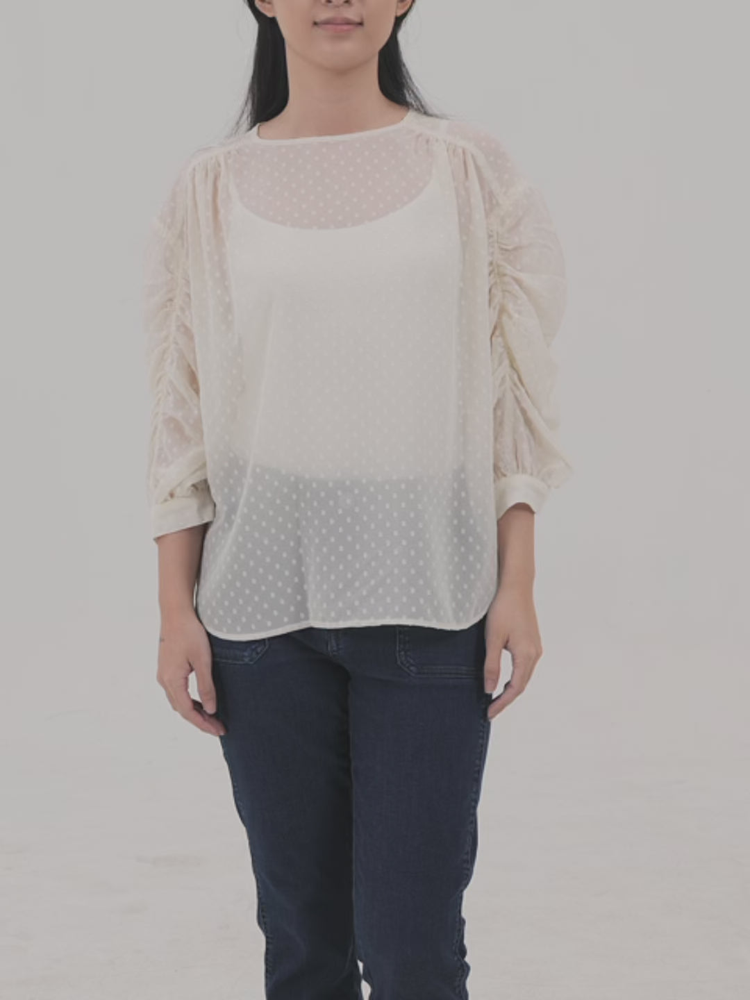 Atasan wanita ini didesain dengan siluet tembus pandang dan motif polkadot. Memiliki detail full kancing di bagian belakang. Terdapat kerutan menyerupai balon pada bagian lengan. Cocok dipakai untuk tampilan kasual dan formal.