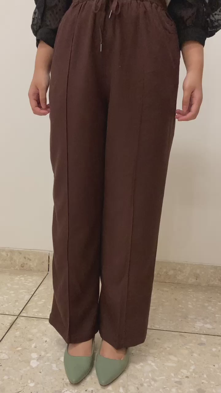 Celana panjang wanita ini didesain dengan cuttingan loose dan sedikit melebar. Terdapat karet dibagian belakang dan pita dibagian depan yang memberikan aksen elegan. Bahannya ringan dan tidak panas, serta terdapat saku pada bagian samping. Cocok digunakan untuk casual atau formal.