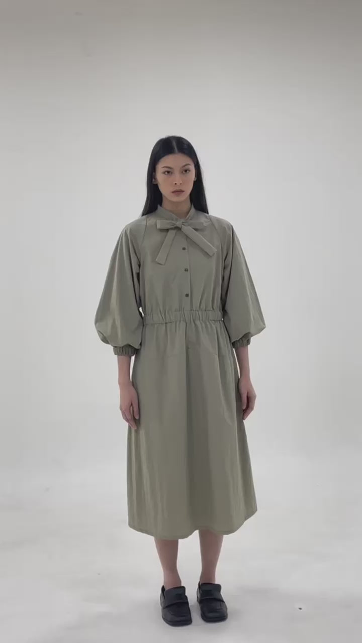 Dress wanita ini didesain dengan leher bulat. Terdapat karet dibagian lengan dan pinggang. Memiliki saku tersembunyi di bagian samping. Terdapat pita di leher yang dapat disesuaikan. Memiliki detail kancing depan sampai bagian pinggang. Memiliki bahan yang halus sehingga nyaman saat dipakai. Cocok untuk dikenakan pada acara formal maupun non formal.