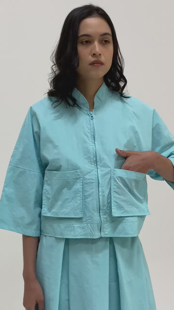 Jaket wanita ini didesain dengan kerah kemeja dan siluet lengan tujuh perdelapan. Memiliki resleting dan dua saku di bagian depan. Terdapat furing sehingga tidak tembus pandang. Memiliki bahan yang halus sehingga nyaman saat dipakai. Cocok untuk tampilan kasual atau formal.