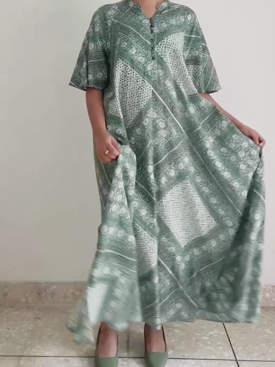 Dress lengan pendek ini di desain dengan model kerah V-Neck serta motif yang unik dan eye catching! Terdapat aksen kancing hidup pada bagian dada dan saku yang berfungsi pada bagian samping.