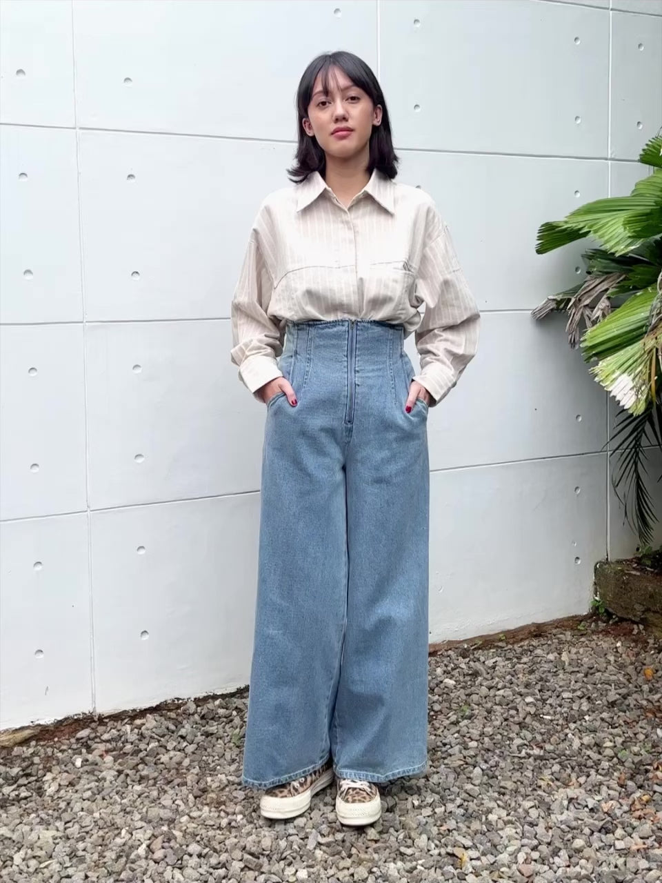 Celana panjang denim wanita ini di desain dengan siluet yang lebar dan pinggang high waist. Terdapat karet di bagian belakang dan resleting pada bagian depan, juga dua saku di sisi samping celana. Celana ini terkesan elegan dengan memadukan atasan crop atau atasan yang slim fit lalu dimasukan ke dalam celana.