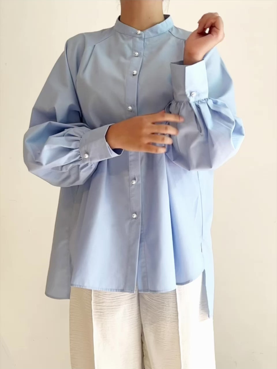 Kemeja wanita oversize ini di desain dengan bentuk kerah sanghai serta model lengan raglan dan full kancing pada bagian depan dengan aksen kancing pearl yang cantik. Bisa dikenakan sebagai outer maupun kemeja biasa. Cocok untuk tampilan kasual atau formal.