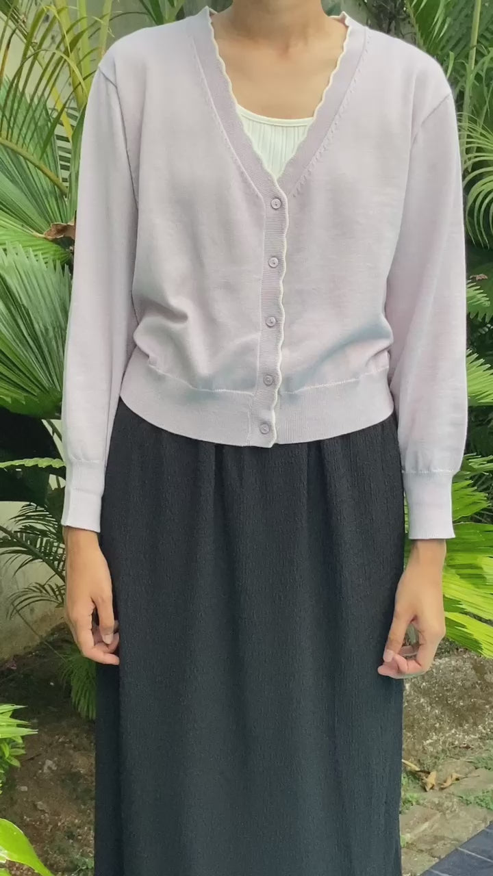 Cardigan wanita ini didesain dengan detail lining berbentuk scallop. Terdapat kancing di bagian depan. Memiliki bahan yang halus sehingga nyaman saat dipakai. Cocok untuk dikenakan pada acara formal maupun non formal.