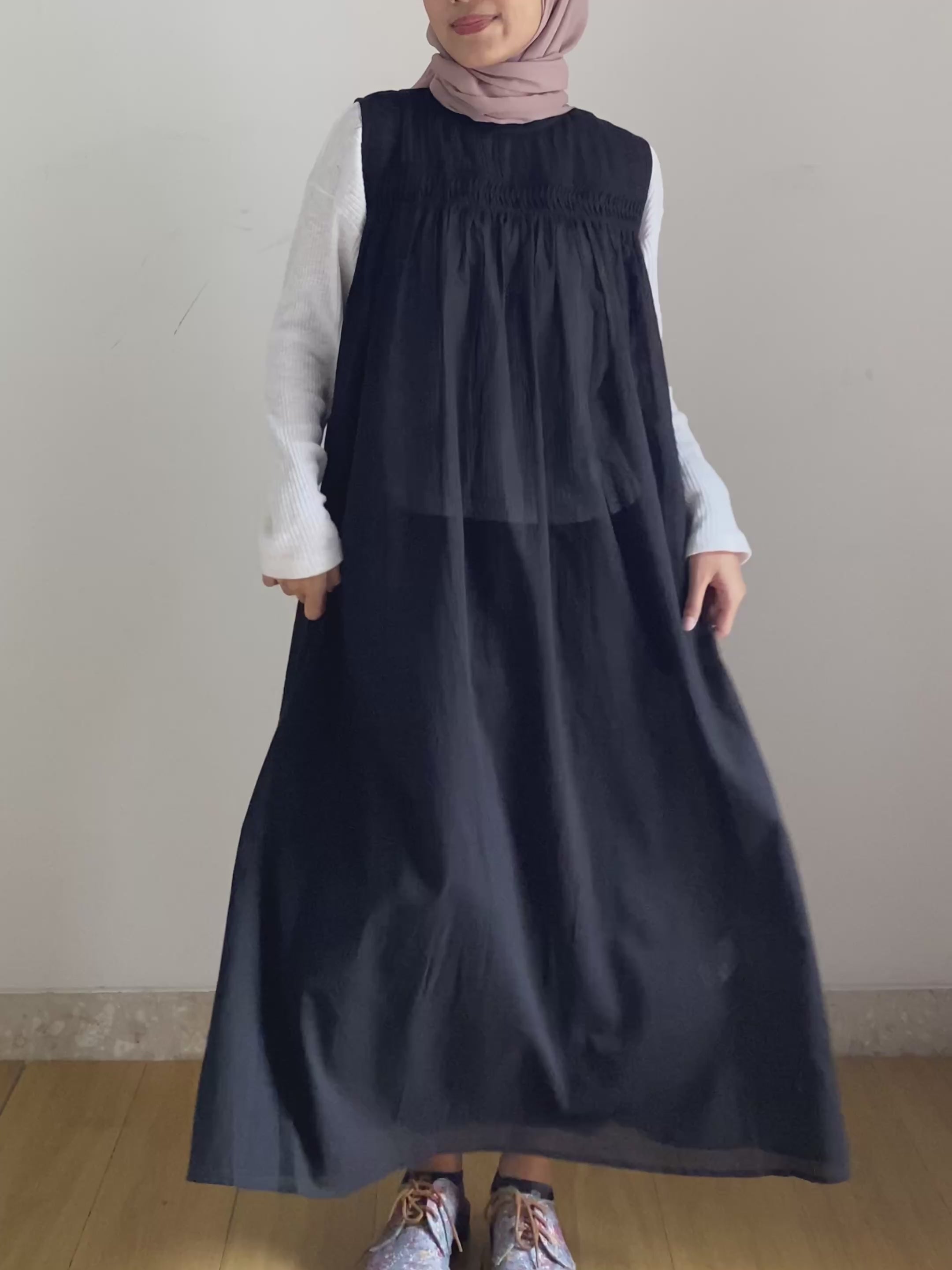 Dress wanita loose tanpa lengan dengan detail yang unik pada bagian atas depan dan belakang, serta terdapat aksen kancing yang berfungsi pada bagian belakang. Dress ini ringan, breathable dan sedikit menerawang, sangat nyaman saat dikenakan.