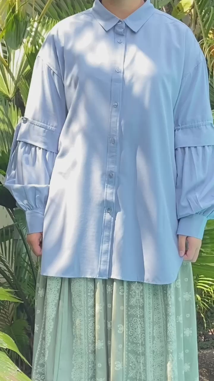 Kemeja wanita ini didesain dengan kerah kemeja dan full kancing depan. Terdapat layer dan pita yang dapat disesuaikan pada bagian siku. Memiliki panjang depan dan belakang yang berbeda. Terdapat slit di sisi kanan kiri baju. Bahannya yang ringan dan halus sehingga nyaman saat dipakai. Cocok untuk dipakai acara formal maupun non formal.