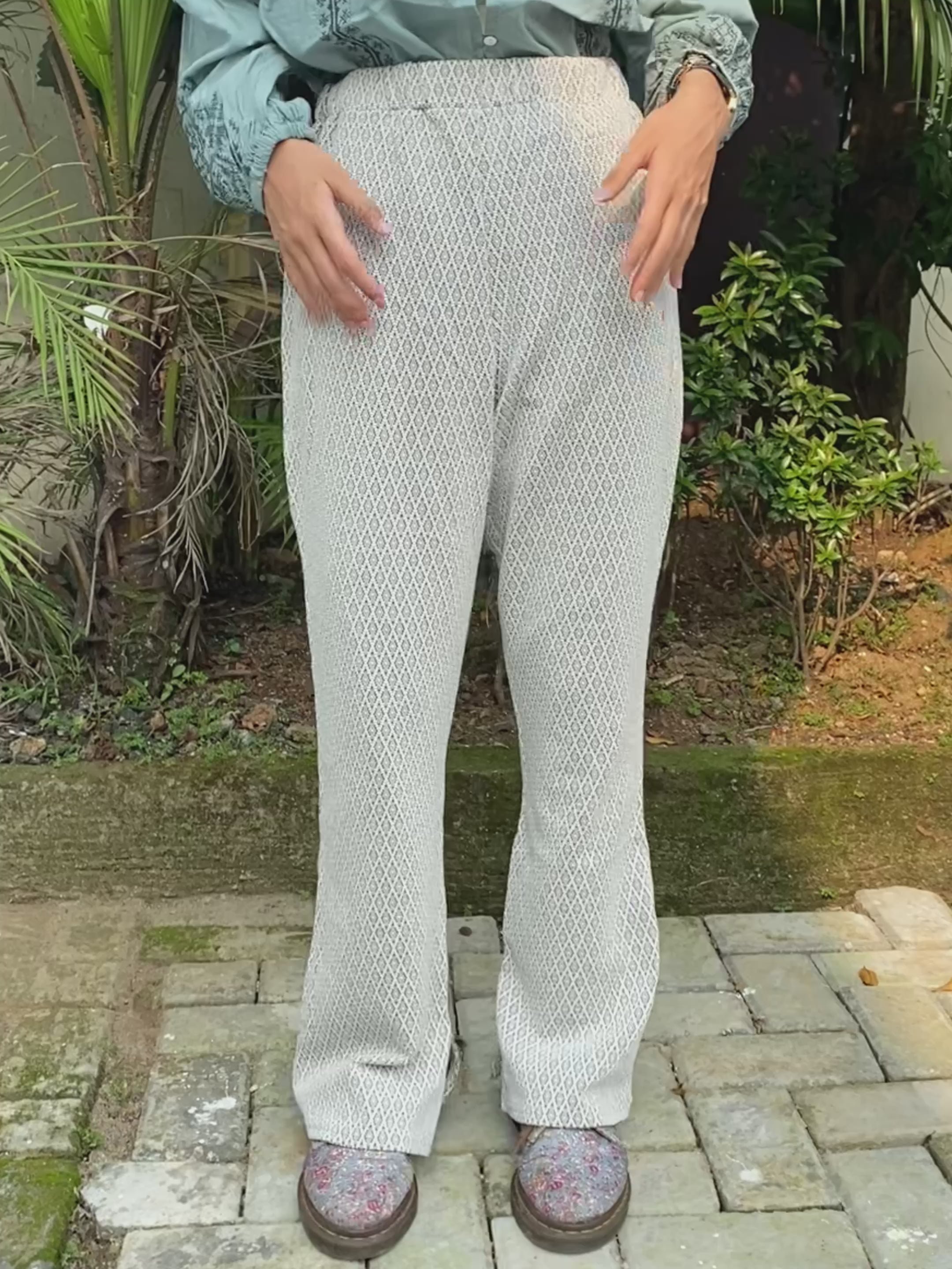 Celana wanita ini di desain dengan motif Geomatric Retro yang eye catching! Terdapat slit pada bagian bawah celana, serta pada bagian pinggang terdapat tali yang dapat di sesuaikan. Sangat cocok di padukan dengan atasan kemeja atau tunik yang polos.