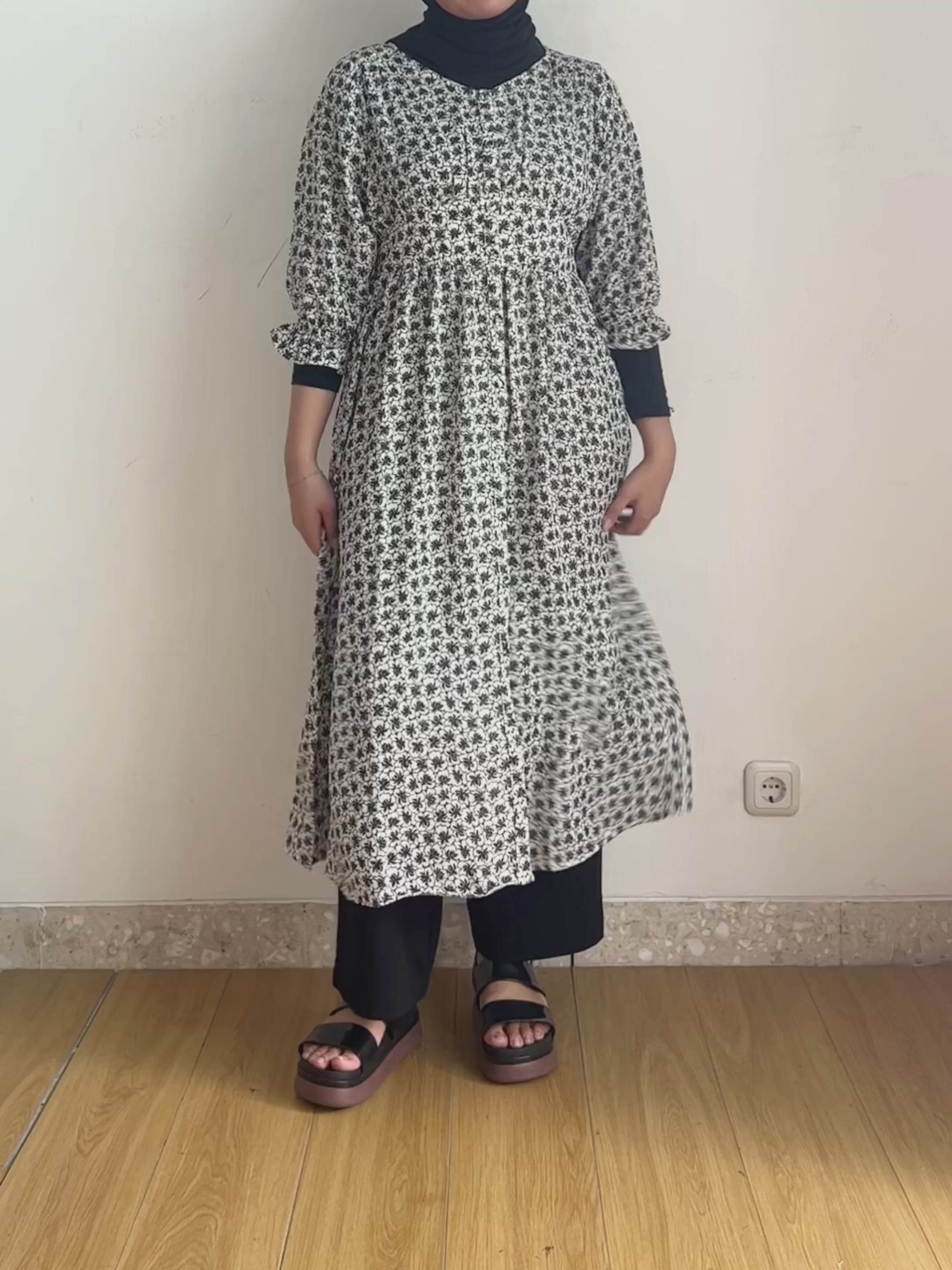 Dress dengan model kerah V-Neck dan motif bunga-bunga, full kancing pada bagian depan serta karet pada bagian pinggang. Terdapat ruffle pada bagian lengan yang memberikan kesan feminin saat dipakai. Bisa dikenakan sebagai Dress saja atau sebagai Outer.