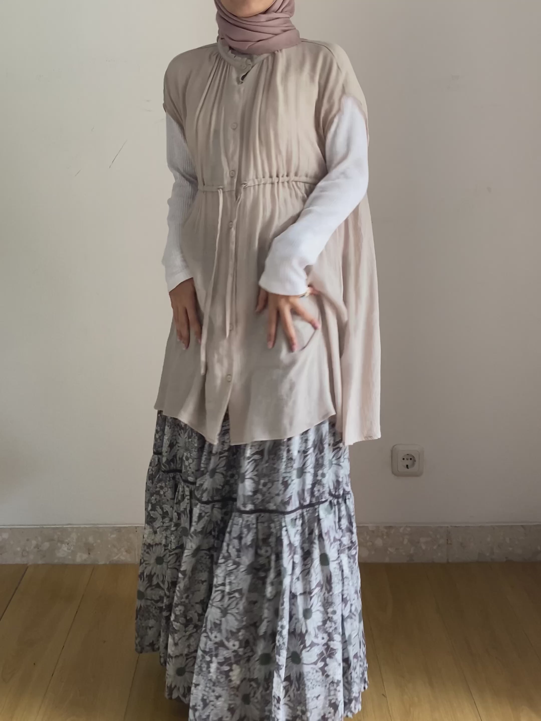 Tunik wanita ini di desain dengan model kerah frills dan French sleeves yang memberikan kesan klasik. Terdapat tali serut pada bagian pinggang dan full kancing pada bagian depan, bisa dikenakan sebagai tunik saja atau outer.
