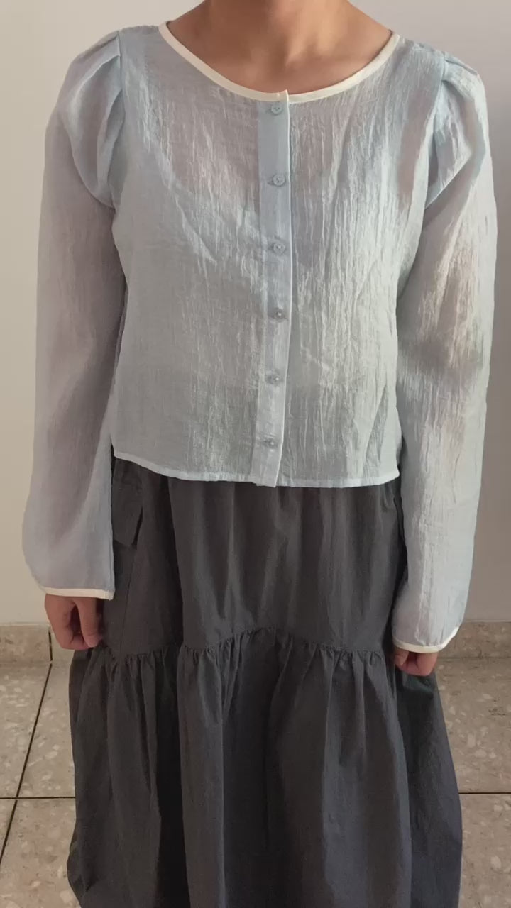 Atasan wanita lengan panjang ini didesain dengan cuttingan crop. Memiliki full kancing pada bagian depan. Terdapat lengan yang bervolume sehingga memberikan kesan feminim. Siluet tembus pandang memberikan kesan yang menarik dan elegan. Bahannya yang ringan dan halus sehingga nyaman saat dipakai. Cocok digunakan sebagai luaran ataupun sebagai atasan biasa.
