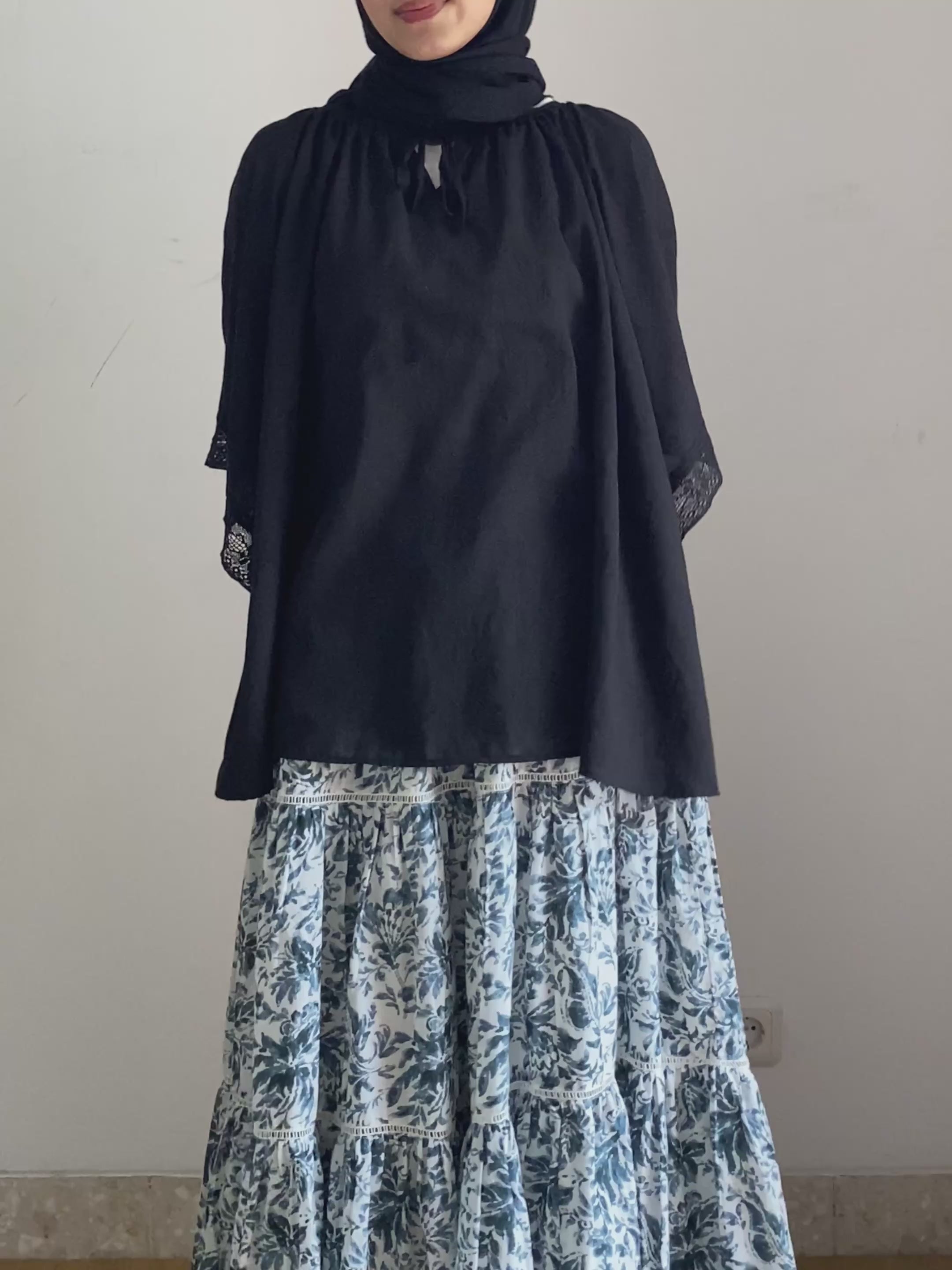 Atasan tunik ini terbuat dari bahan yang halus dan breathable sehingga nyaman saat di kenakan, di desain dengan cutting yang loose dengan kerah V-neck serta terdapat tali pita pada bagian leher yang dapat disesuaikan. Terdapat aksen brukat pada bagian lengan yang meberikan kesan elegan.