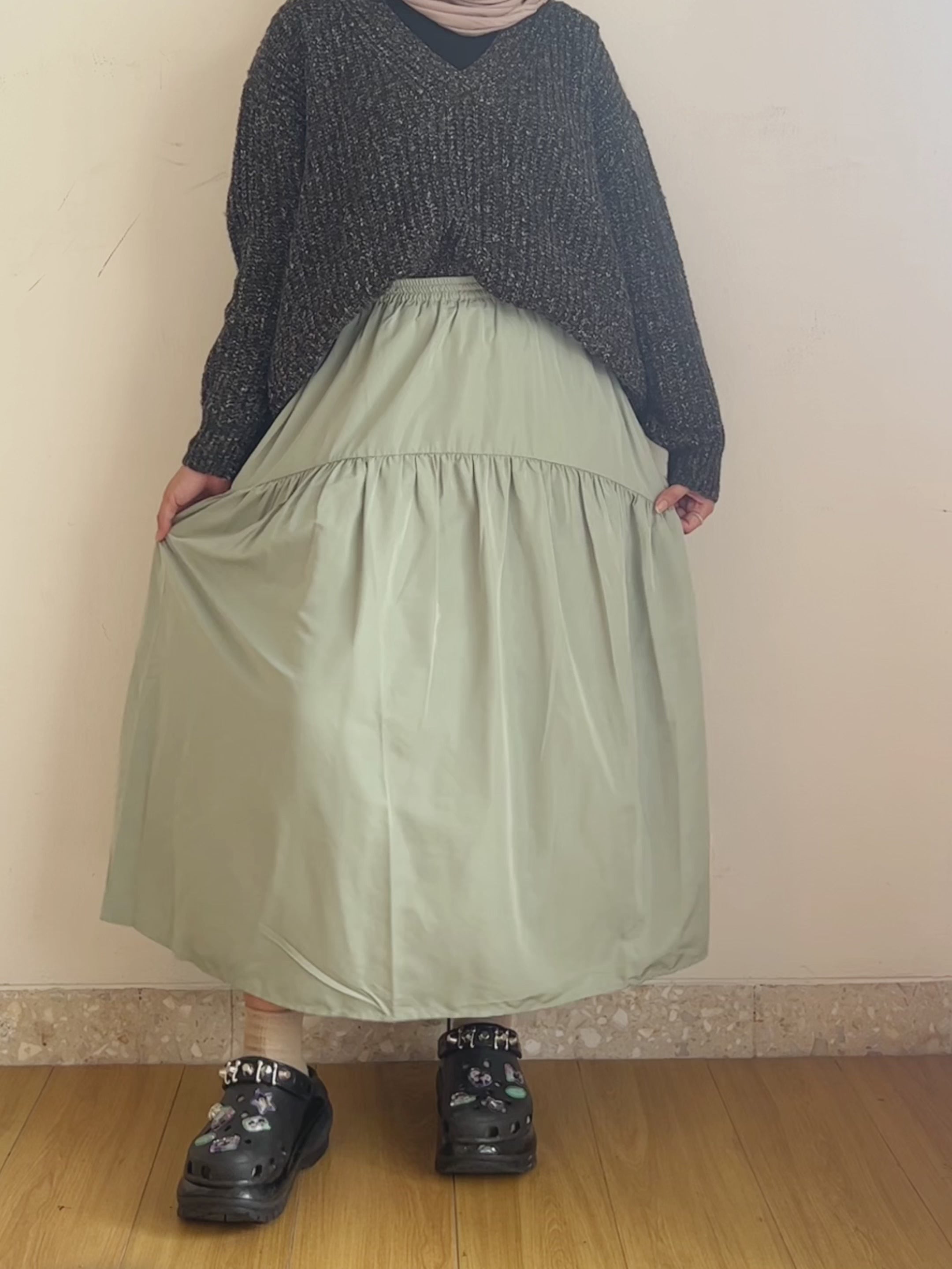 Tiered skirt ini di desain dengan bentuk oval hingga bagian belakang sehingga memberikan kesan yang unik dan cantik saat dikenakan, terdapat kain pada lapisan dalam sehingga rok ini tidak tembus pandang. Bagian pinggang sangat elastis karna full karet, serta terdapat saku pada bagian samping. Cocok dipadukan dengan atasan kemeja, blus maupun pakaian rajut.