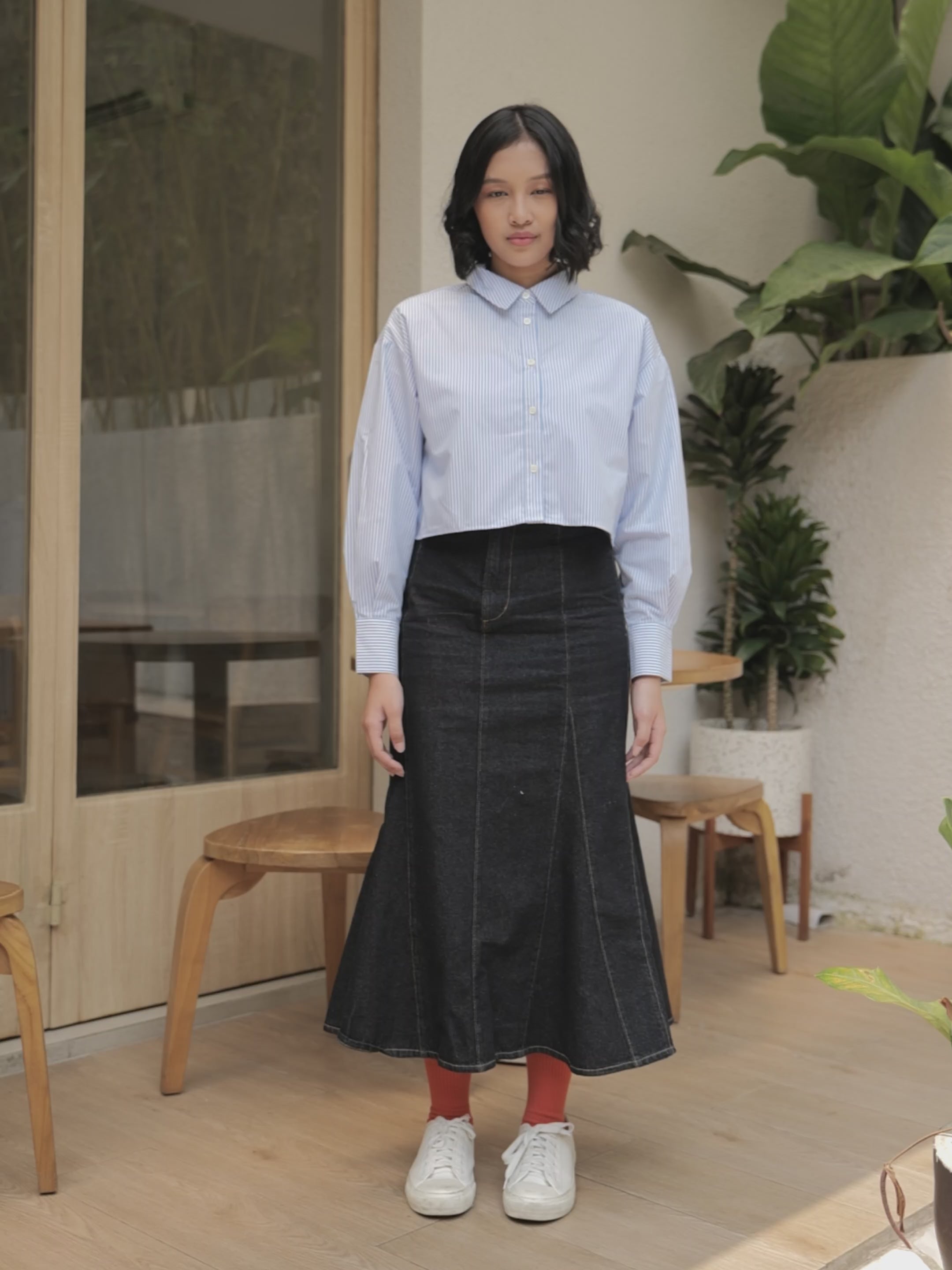 Denim skirt ini di desain dengan pola cutting mermaid yang memberikan kesan yang unik dan cantik. Terdapat zipper dan kancing pada bagian depan, serta saku yang berfungsi pada bagian belakang. Juga terdapat karet elastis pada bagian belakang pinggang.