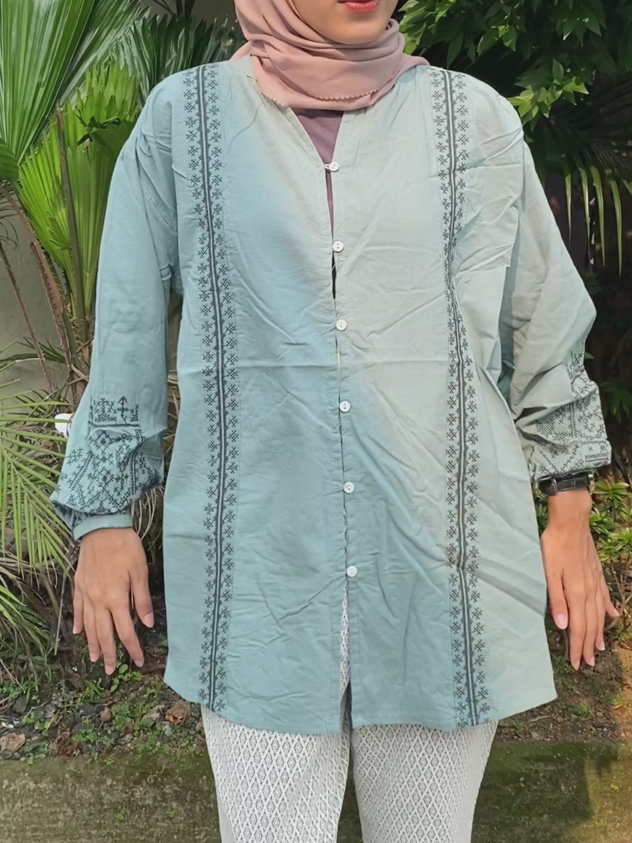 Tunik ini terbuat dari bahan indian cotton yang halus dan ringan, dengan detail aksen bordir yang unik dan bergaya retro. Serta di desain dengan bentuk kerah V-neck dan full kancing pada bagian depan. Bisa dikenakan sebagai tunik saja atau bisa dikenakan sebagai outer untuk tampilan yang lebih trendy!
