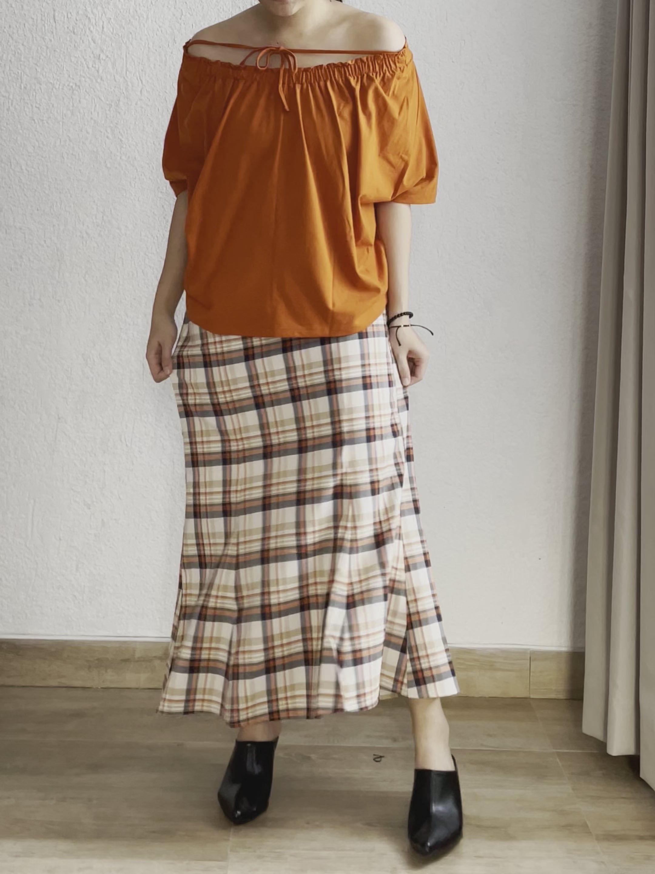 Rok ini di desain dengan bentuk pola mermaid yang terlihat elegan, dengan motif kotak-kotak dan perpaduan warna yang cantik. Terdapat karet pada bagian belakang pinggang serta zipper pada bagian samping.