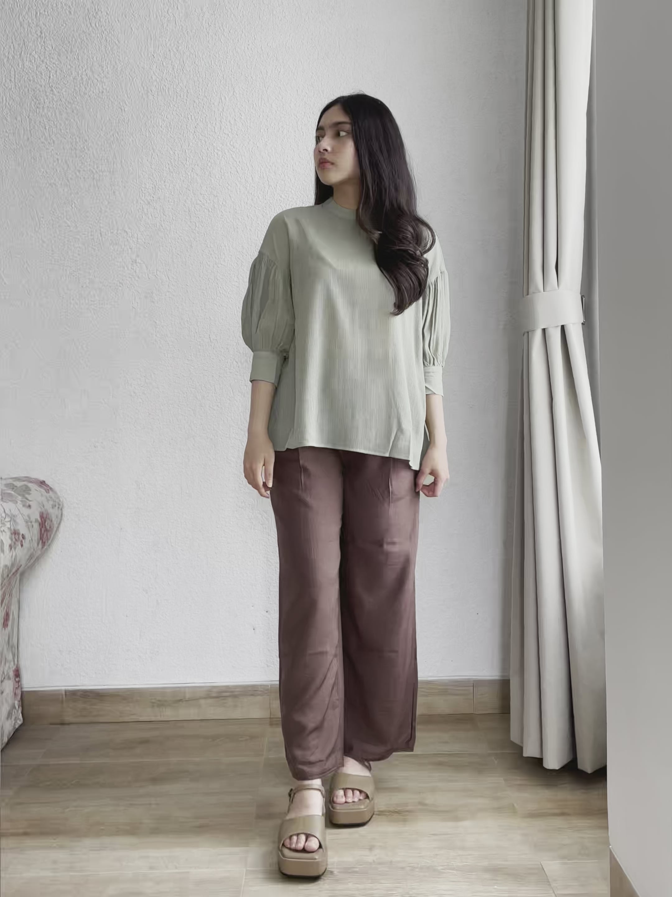 - A high-neck blouse with a silky texture