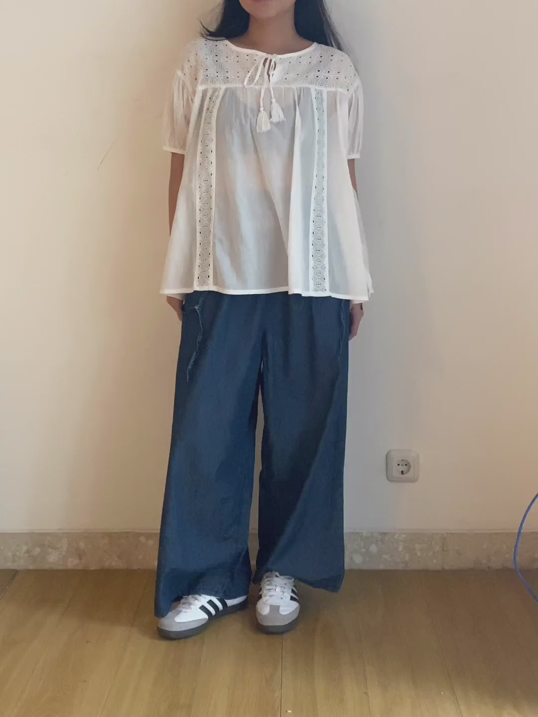 Tunik wanita dengan perpaduan bahan brukat yang memberikan kesan unik dan cantik, pada bagian lengan di desain bervolume dan pada bagian dada terdapat tali pita yang dapat di sesuaikan.