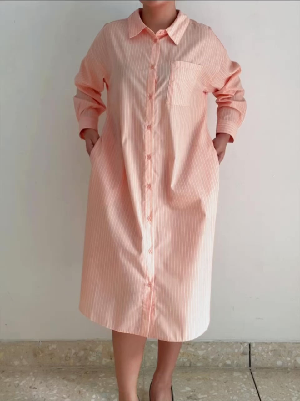 Dress wanita lengan panjang ini di desain dengan motif garis-garis juga model kerah basic dan saku, serta full kancing pada bagian depan. Terdapat tali pada bagian pinggang yang dapat disesuaikan. Bisa juga di kenakan sebagai dress saja atau sebagai outer.