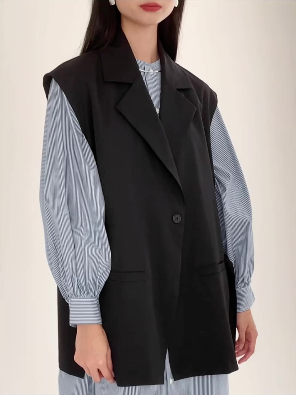 Vest wanita ini didesain dengan siluet oversized. Terdapat satu kancing dan dua saku di bagian depan. Vest ini juga dilengkapi belt yang dapat disesuaikan dengan mudah. Cocok untuk dikenakan pada acara formal maupun non formal.