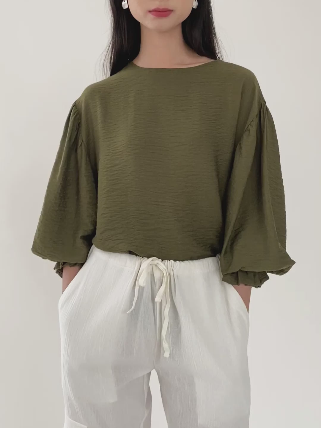 Blouse ini didesain dengan model cutting yang loose dan lengan balon, dengan bahan yang ringan dan halus, sehingga sangat nyaman saat dikenakan. Terdapat karet di bagian lengan dan kancing di bagian belakang.