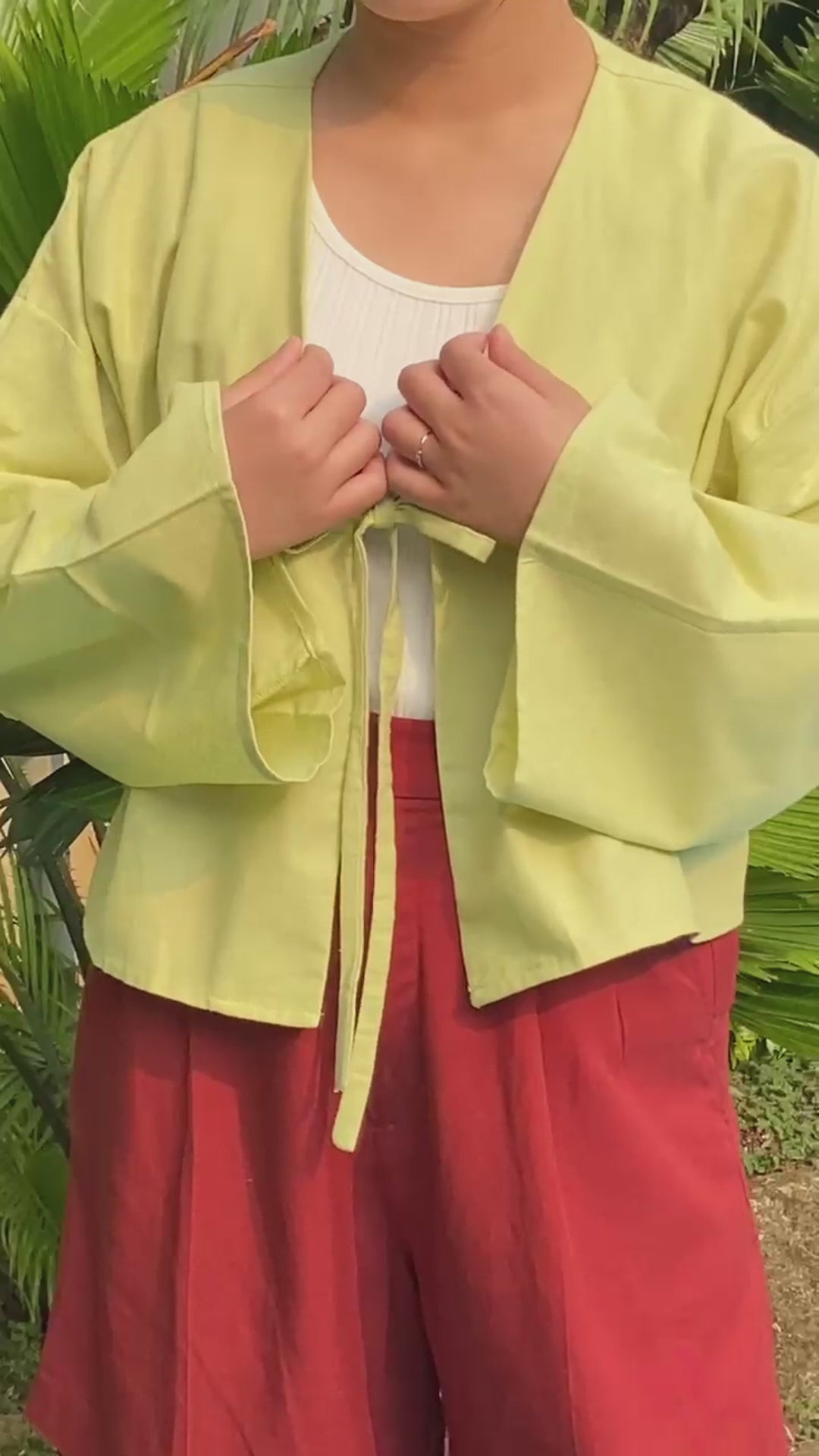 Outer crop ini didesain dengan potongan oversized. Memiliki detail tali yang dapat disesuaikan di bagian depan dan lengan berbentuk bell arm. Cocok dipakai untuk acara formal dan non formal.