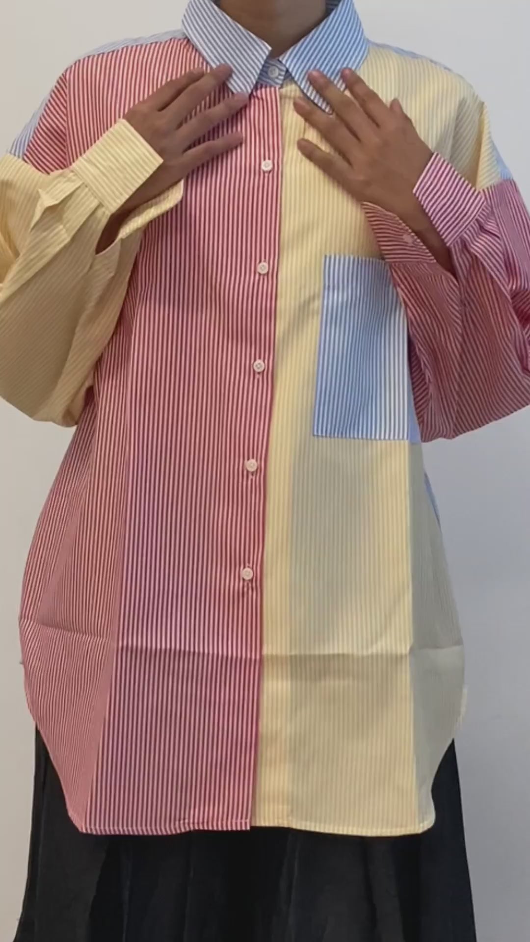 Kemeja oversized ini didesain dengan kerah kemeja. Memiliki full kancing di bagian depan. Memiliki satu saku depan dan hiasan kancing di sisi kiri. Kombinasi empat bahan stripe yang berbeda memberikan kesan yang elegan. Cocok digunakan untuk sehari-hari.