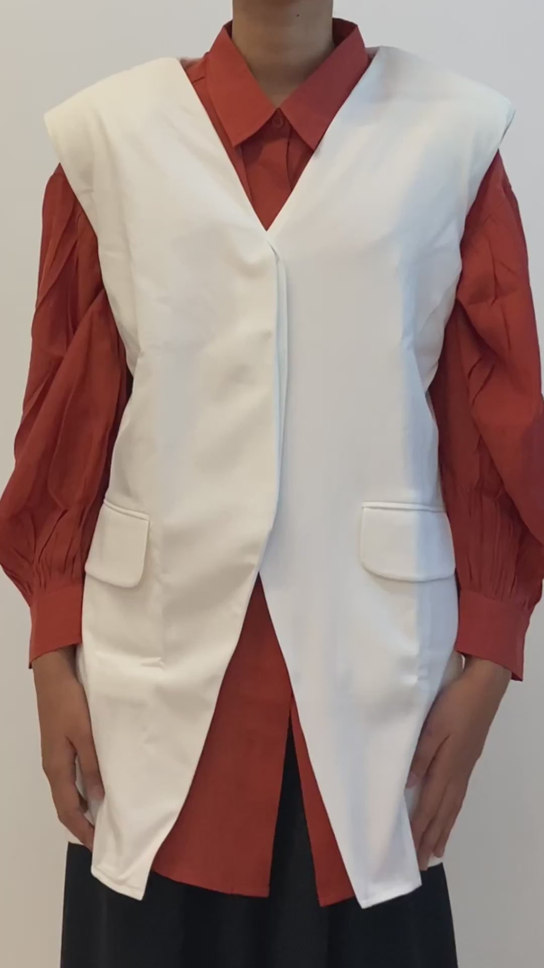 Vest wanita ini didesain dengan siluet oversized. Terdapat tiga kancing dan dua saku di bagian depan. Vest ini menggunakan padding di bagian bahu sehingga membuat yang memakai terlihat tegak dan elegan. Vest ini juga dilengkapi belt yang dapat disesuaikan dengan mudah. Cocok untuk dikenakan pada acara formal maupun non formal.