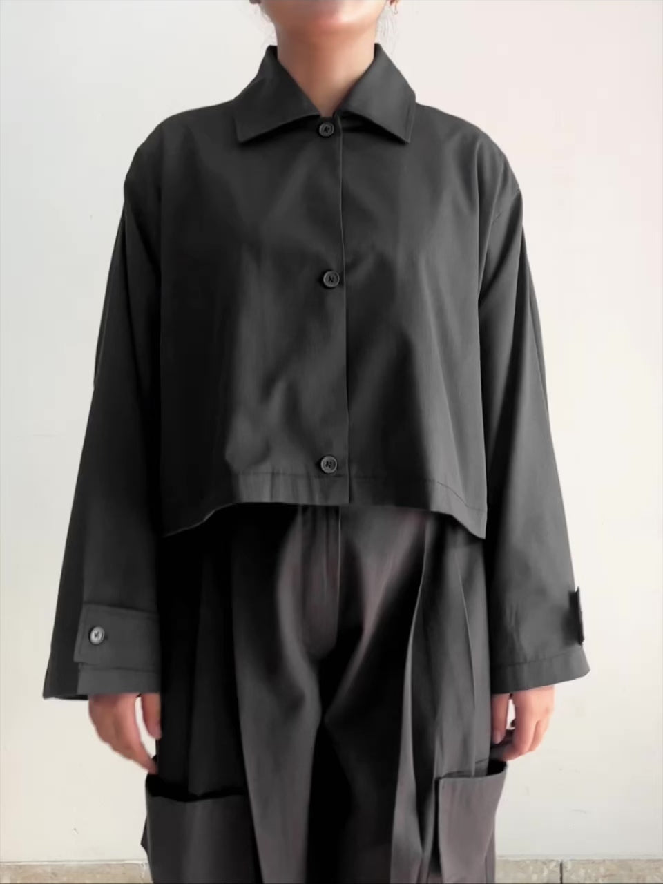 Jaket crop wanita ini didesain dengan kerah kemeja dan full kancing depan. Memiliki dua saku di bagian depan dan volume di lengan untuk menambah kesan feminim. Cocok dikenakan untuk acara formal maupun kasual.