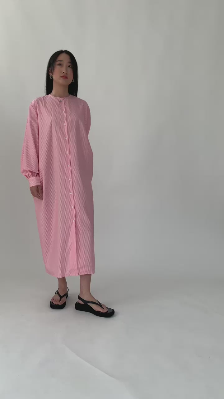Dress wanita lengan panjang ini didesain dengan siluet maxi dan full kancing di bagian depan. Memiliki kerah bulat dengan motif stripe. Terdapat aksen balloon sleeves sehingga menciptakan look yang elegan. Cocok dikenakan untuk acara formal maupun non formal dan juga dapat dikenakan sebagai outer.