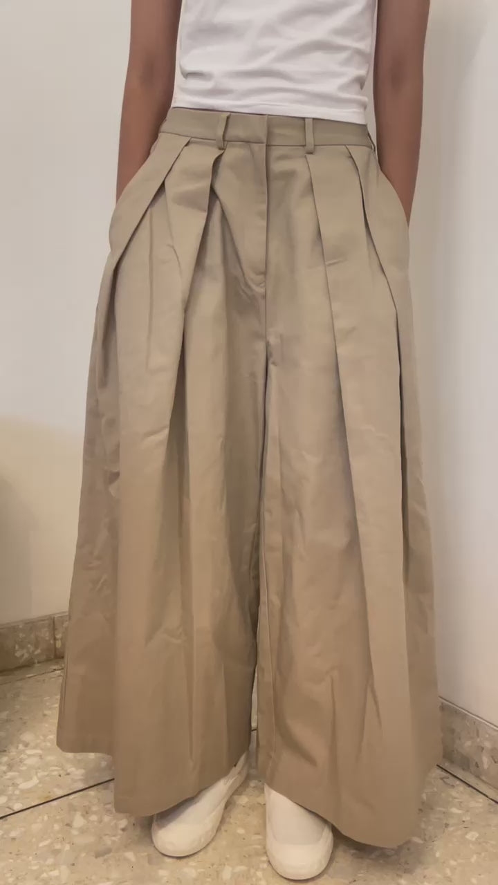 Celana dengan potongan lebar ini mempunyai detail double pleat di bagian depan. Terdapat resleting dibagian depan dan karet di bagian belakang. Memiliki saku di bagian kanan dan kiri. Bahannya yang ringan dan halus sehingga nyaman saat dipakai. Cocok dipakai untuk tampilan kasual dan formal.