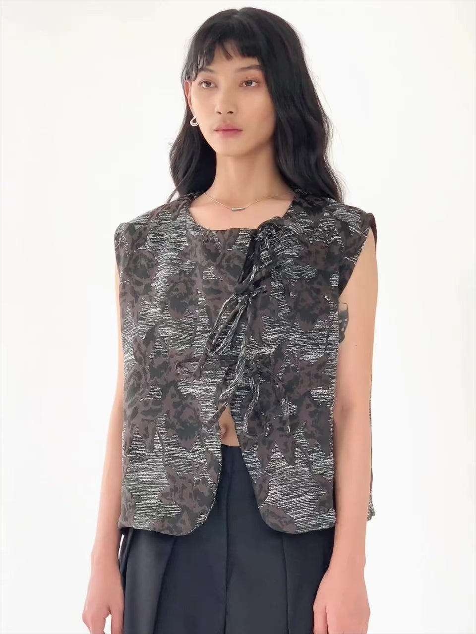 Vest ini didesain dengan leher bulat. Terdapat tiga tali di bagian depan yang dapat disesuaikan. Cocok dipadukan dengan inner berlengan maupun tanpa lengan.