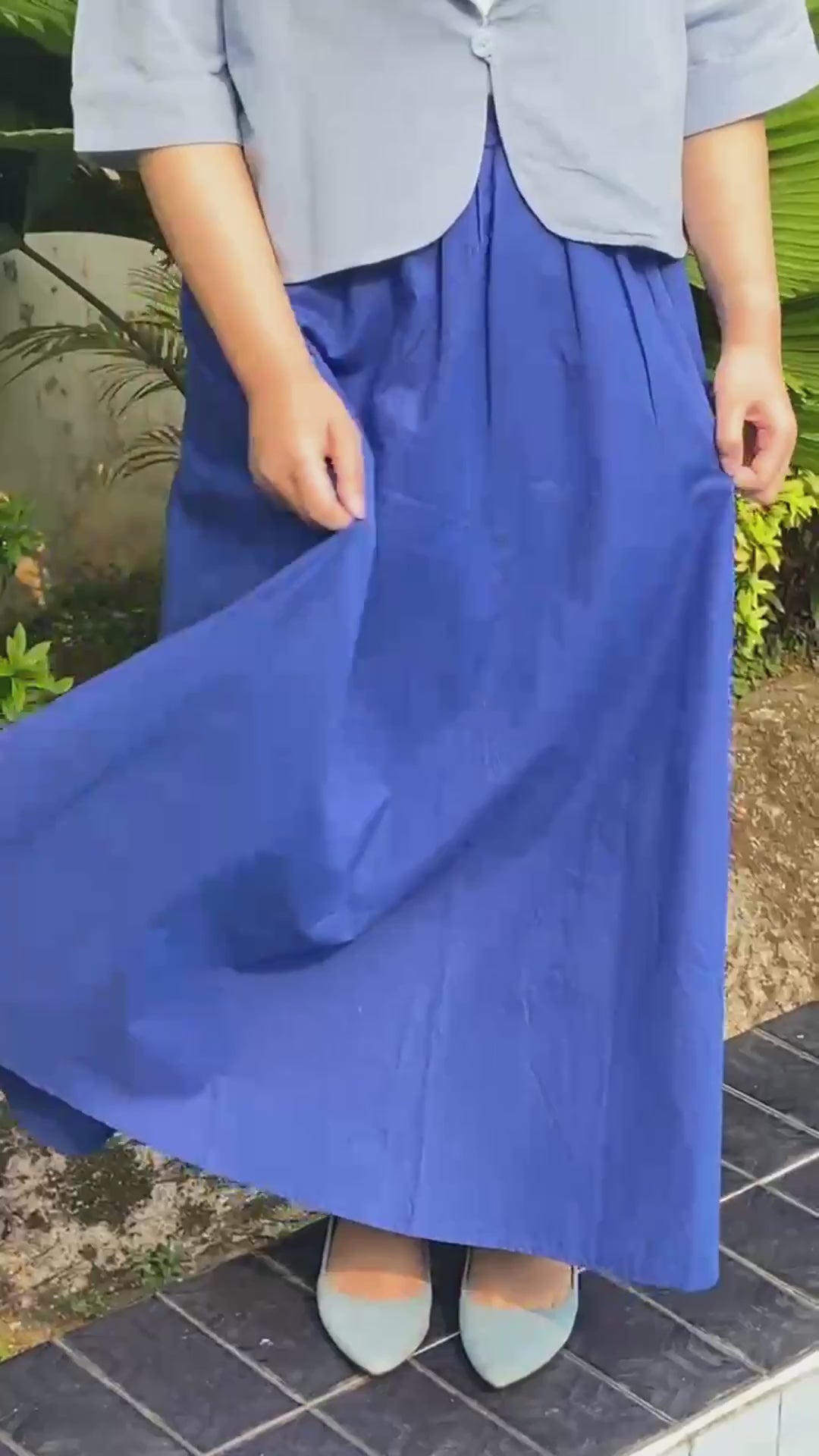 Rok ini didesain dengan siluet yang melebar pada bagian bawah sehingga memberikan kesan yang feminim. Terdapat kain pada lapisan dalam sehingga tidak tembus pandang. Memiliki karet di pinggang dan dua saku di sisi kanan dan kiri rok. Cocok dipadukan dengan kemeja untuk tampilan formal maupun sweatshirt untuk tampilan kasual.