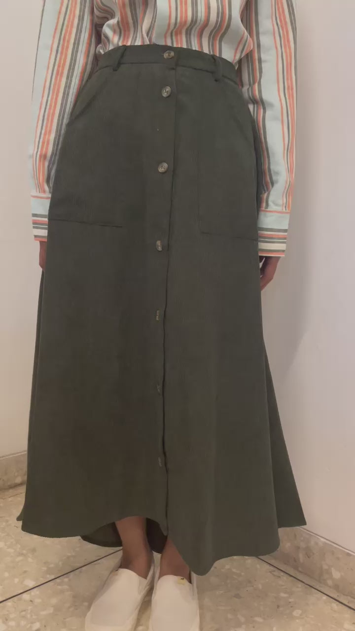 Rok wanita ini didesain dengan siluet I-line sehingga membuat yang mengenakan terlihat elegan. Memiliki bukaan full kancing pada bagian depan. Terdapat karet di bagian belakang. Memiliki detail dua saku depan dan dua saku belakang. Bahannya yang ringan dan halus sehingga nyaman saat dipakai. Cocok dikenakan untuk acara kasual.